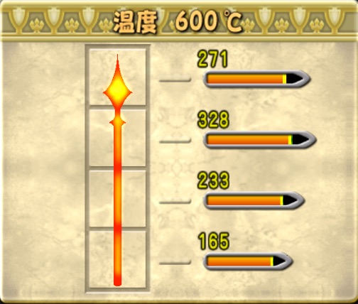威力会心率上昇とは、温度が200の倍数だとゲージが成功ゾーンに届いてないいずれかのマスがオレンジ色になり、そのマスは次のターンにのみ、たたくチカラが2倍になって会心率が大幅に上がる。