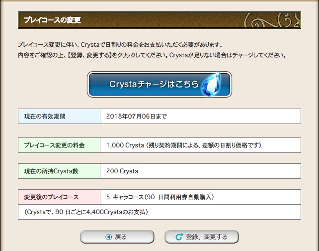 メインアカウントで見てみたら、今日は5月12日で7月6日まで5キャラ変更してみようとすると、プレイコース変更の料金について日割りと出ているが、普通に2ヶ月分の料金でした![]()