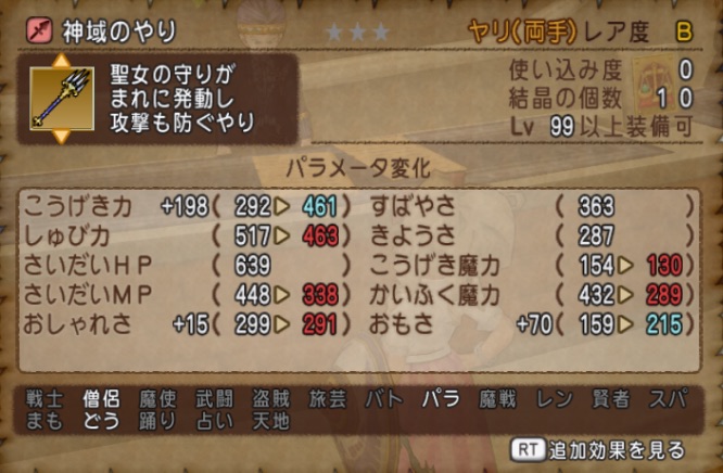 【武器鍛冶】神域のヤリの数値!地金の特性・必要な素材など 2018-05-31 みぃ ver4.2, 武器数値 0 シェア99レベル装備の神域のヤリの数値をフレのオーディンに教えてもらった、みぃです スマホアプリの鍛冶ツールや鍛冶シミュレーターに数値追加しました 内容神域のヤリの数値神域のやり必要な素材 神域のヤリの数値 地金のタイプは、集中力変化(会心半減) 260〜272 316〜328 229〜237 161〜167 神域のやり 武器ガード率+4% 行動時3%で聖女の守り 必要な素材 アステライト鉱石×40 せいれいせき×40 汗と涙の結晶×90 虹色のオーブ×21 ようせいのひだね×50 シェア