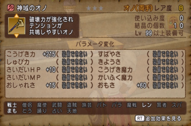 【武器鍛冶】神域のオノの数値!地金の特性や必要な素材も 2018-05-31 みぃ ver4.2, 武器数値 0 シェア99レベル装備の神域のオノの数値をフレのオーディンに教えてもらった、みぃです スマホアプリの鍛冶ツールや鍛冶シミュレーターに数値追加しました 内容神域のオノの数値神域のオノについて必要な素材 神域のオノの数値 地金のタイプは、会心・威力上昇(会心マス) 190〜201 182〜192 150〜160 212〜218 158〜164 120〜130 神域のオノについて 全ての攻撃ダメージ+3% 共鳴のテンションアップ+5% 必要な素材 アステライト鉱石×40 ひかりの石×90 汗と涙の結晶×90 虹色のオーブ×21 ようせいのひだね×50 シェア